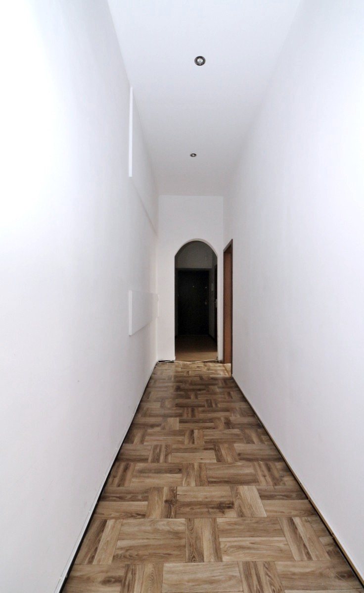 It comprises three rooms, one in an ensuite building, a small kitchen, a hallway, and a bathroom with a toilet. The unit is located in the second building line (an outbuilding), and its windows overlook the courtyard, ensuring a quiet environment.