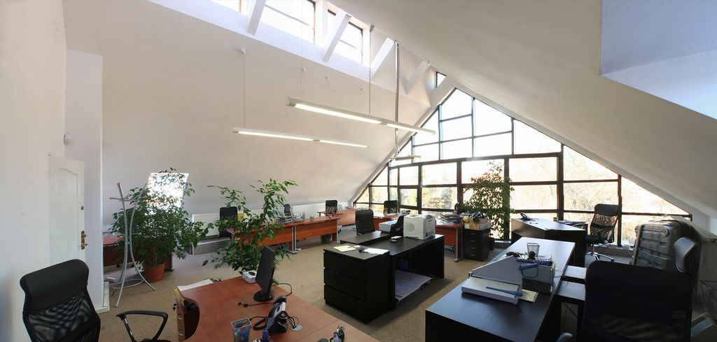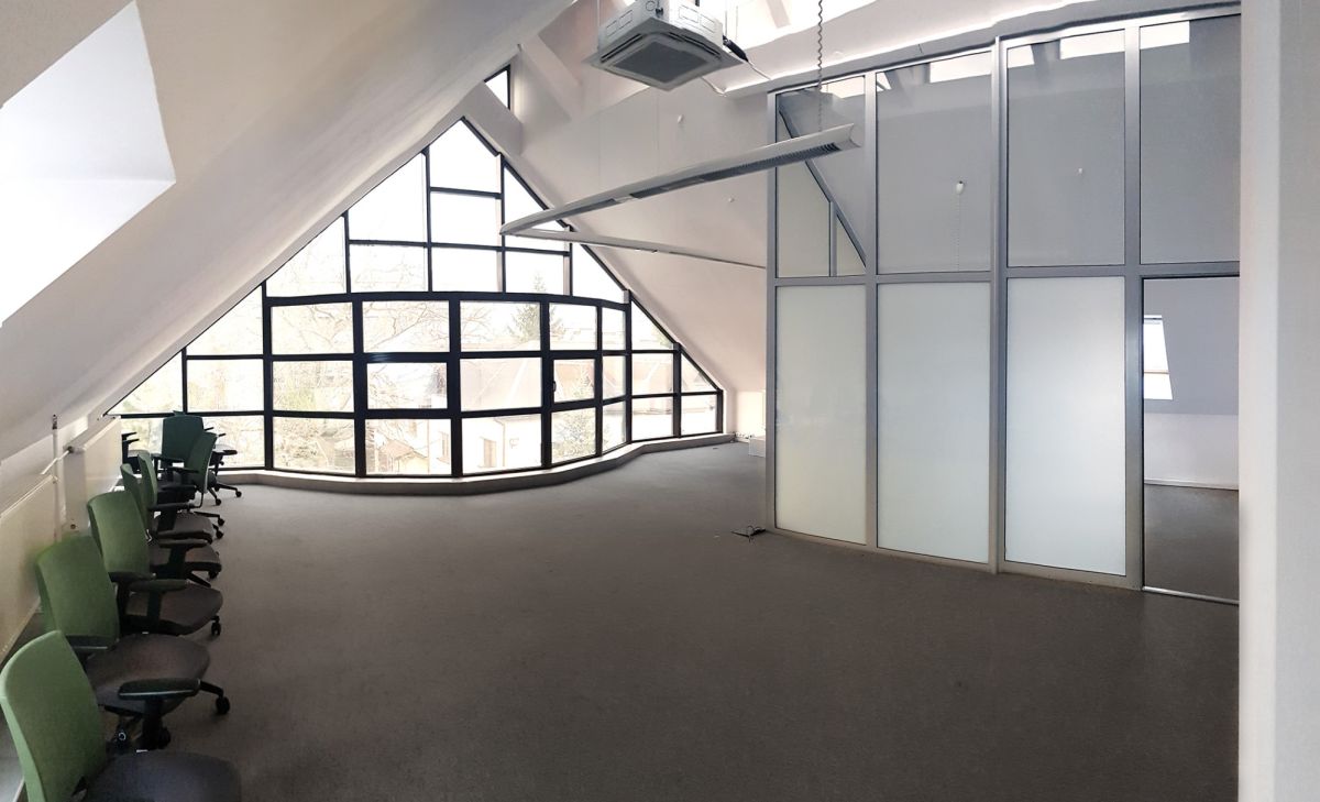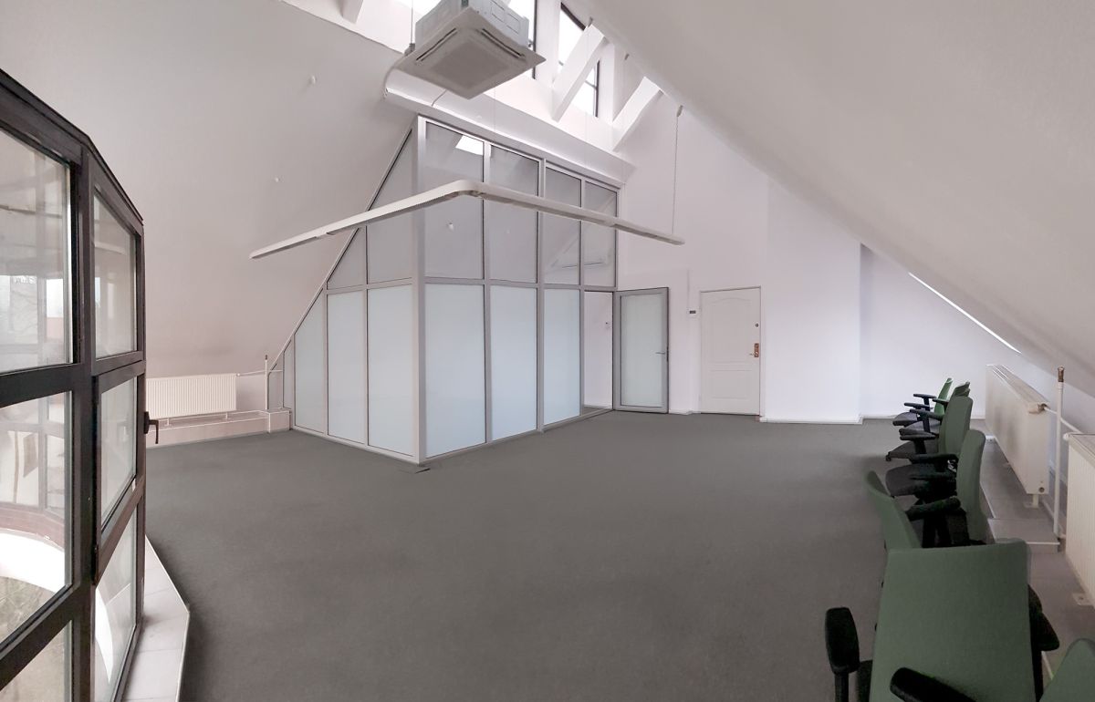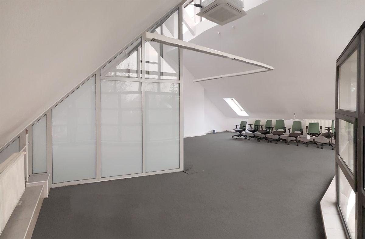 The interior is very bright - located in the sloped ceiling of a high attic, allowing for varying room heights (up to 7 meters) and numerous façade and skylight windows. The space is equipped with air conditioning, pendant lighting, electrical, computer, and alarm systems. The unit is equipped with configurable fiber-optic internet connections. The floor is carpeted.