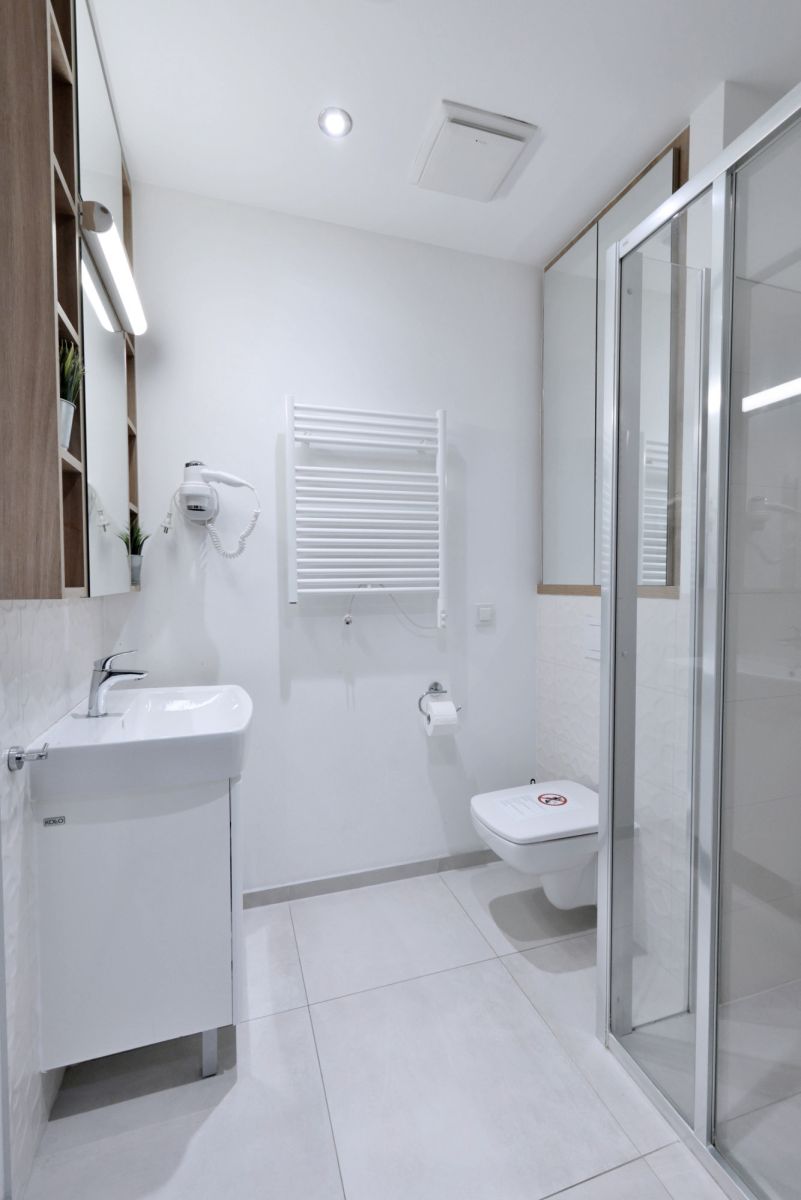 * łazienki z kabiną prysznicową.