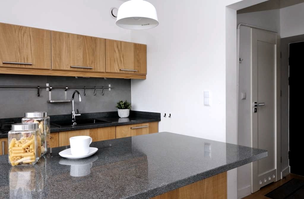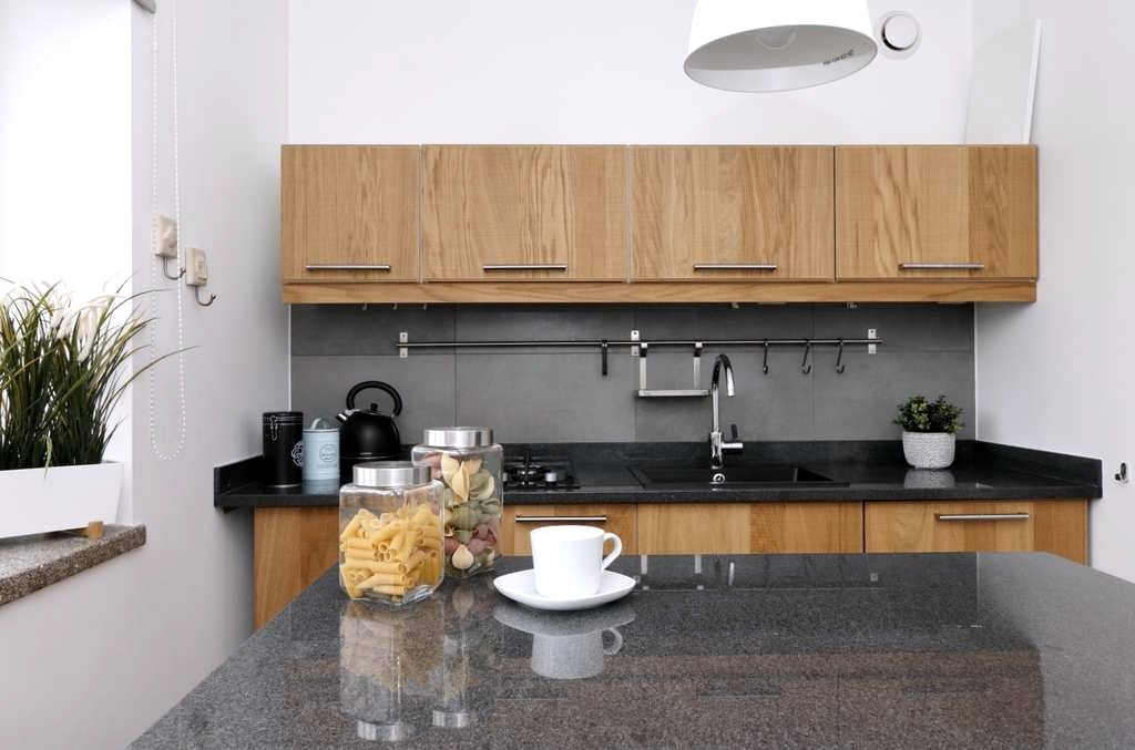 W kuchni meble na wymiar z wyspą w której znajduje się mikrofalówka z funkcją piekarnika