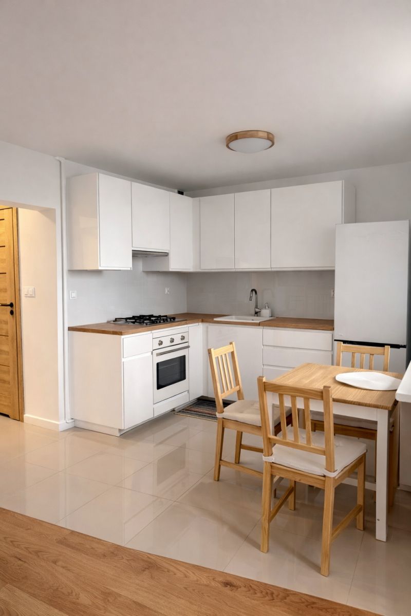 Salon z aneksem kuchennym: Przestronna strefa dzienna z jasną kuchnią wyposażoną w okno, która otwiera się na salon, tworząc nowoczesną i pełną światła przestrzeń.