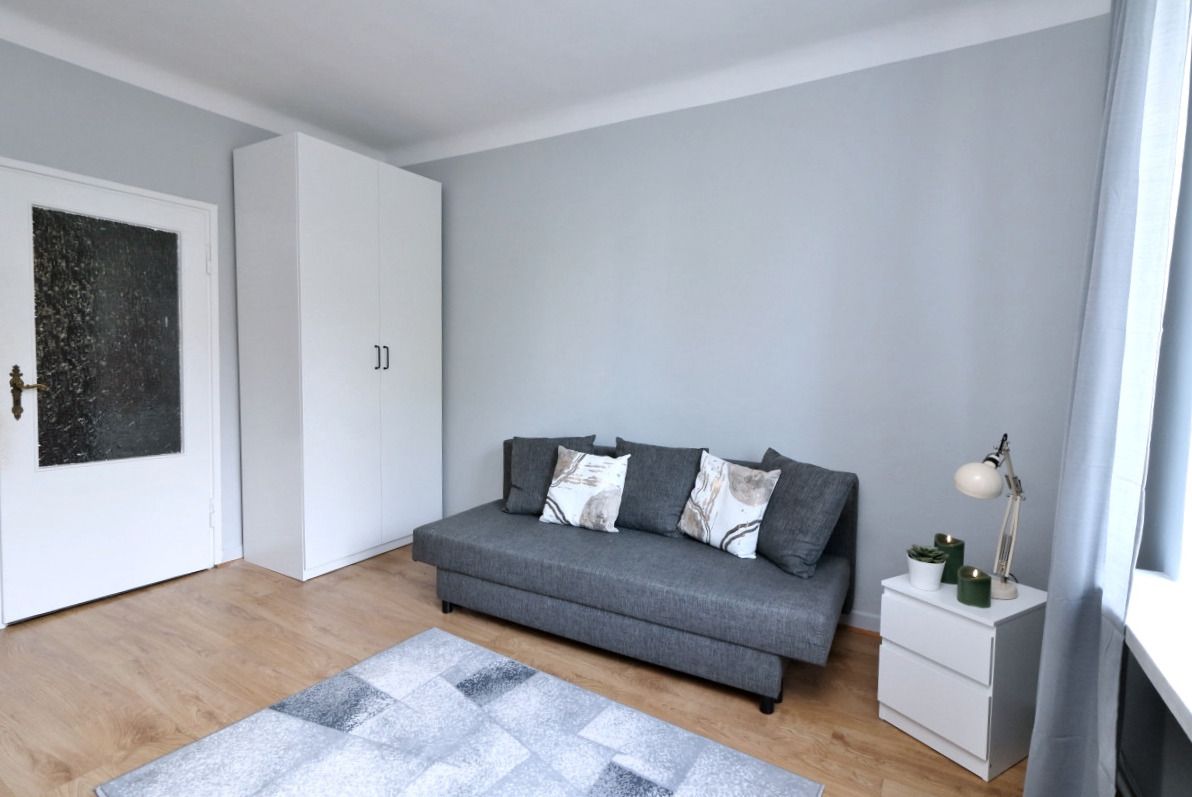 The living room features a large, new sofa and a 2-square-meter wardrobe. The bedroom features a new IKEA sofa and a 1-square-meter wardrobe.