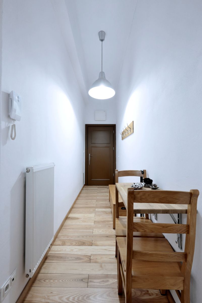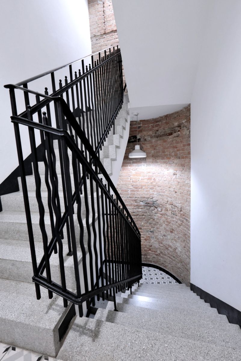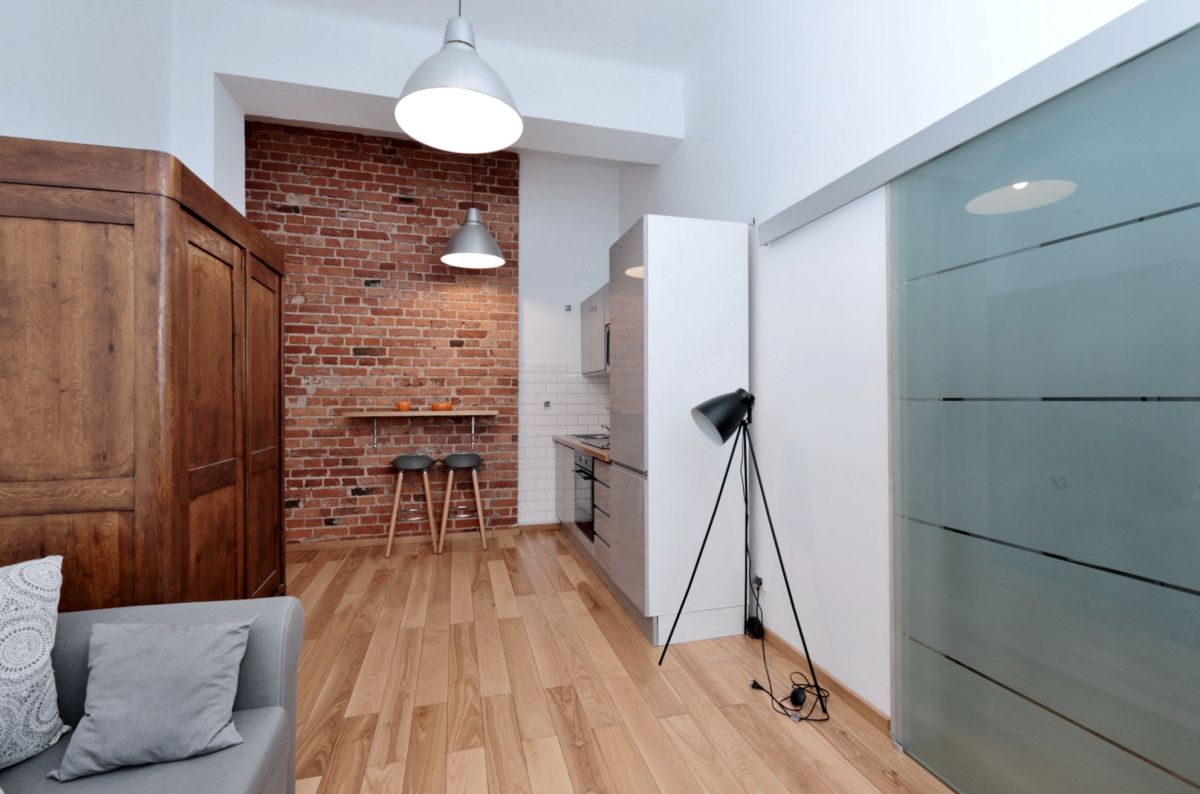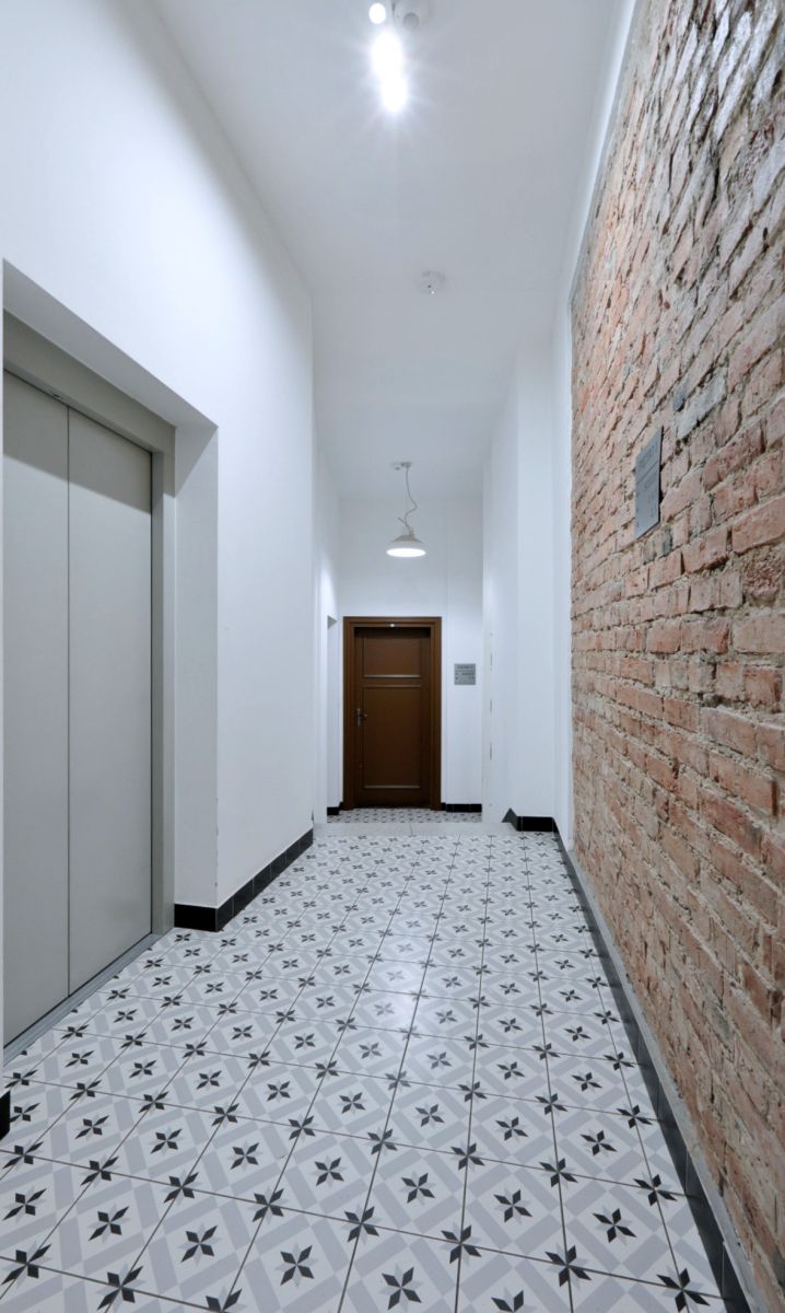 Both the building and the apartment have been renovated, with brick accents on the walls, reflecting the atmosphere of an old tenement building.