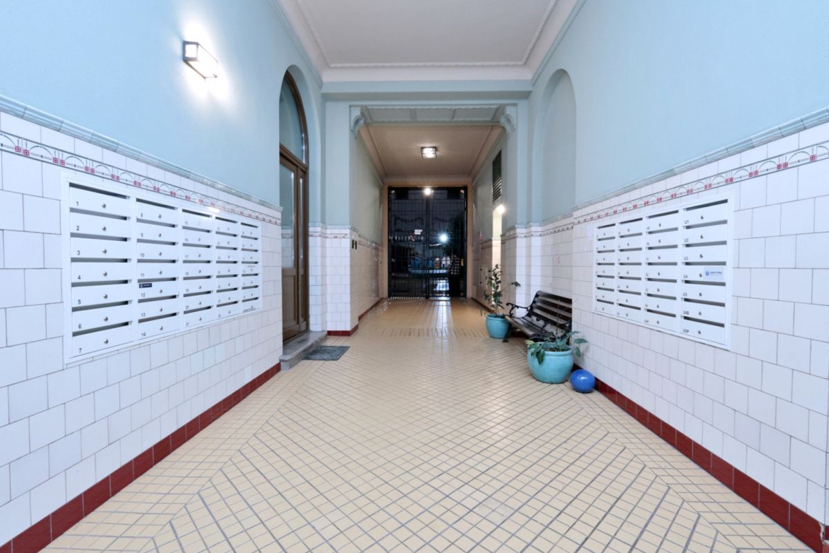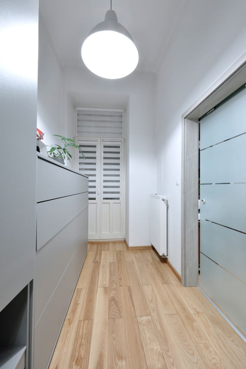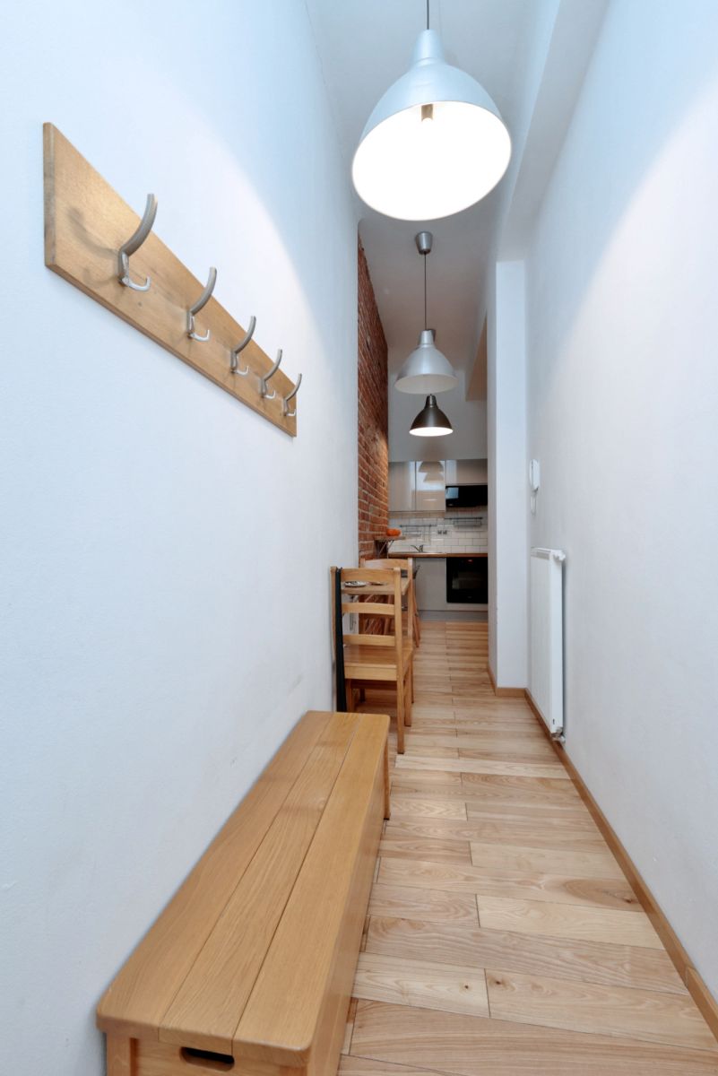 Both the building and the apartment have been renovated, with brick accents on the walls, reflecting the atmosphere of an old tenement building.