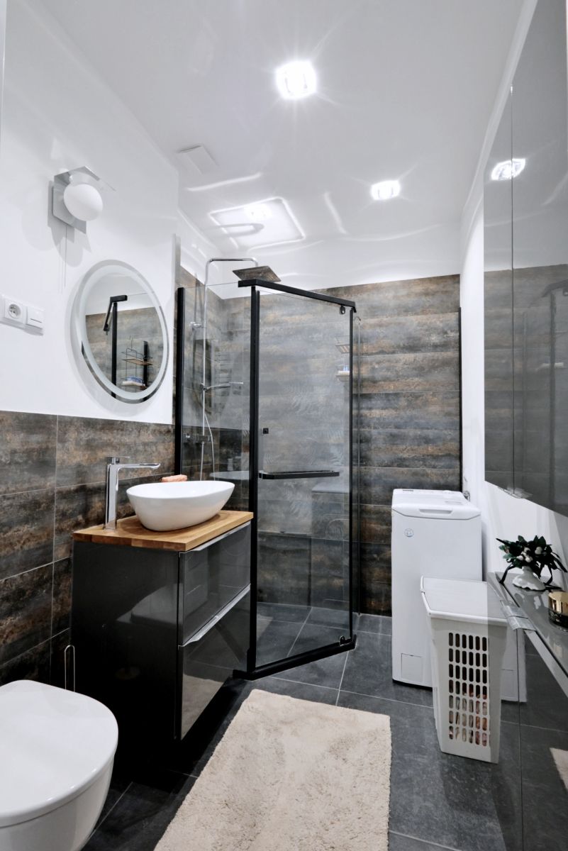A very nice, renovated bathroom with a shower, washing machine, and toilet.