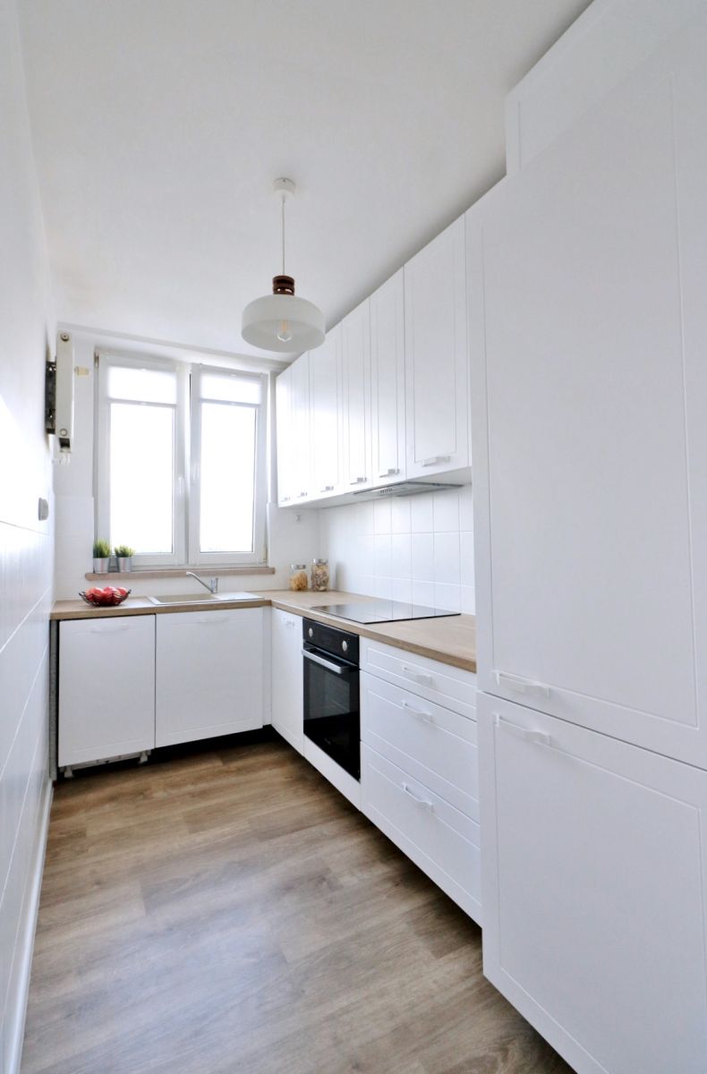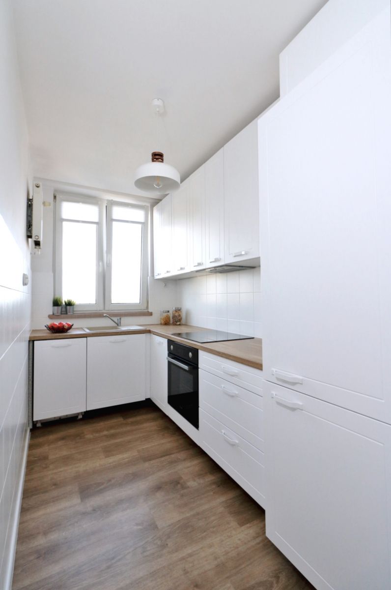 Kuchnia widna z oknem, piekarnik, zmywarka, lodówka, płyta elektryczna